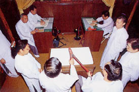 元年,齊桓公用管稱霸期間漸漸銷息,久之無跡無蹤。東漢光武帝時代,才由當代朝廷的王子公孫發起揮鸞聽問國政,寺廟僧尼道士收聽道緣,其最盛時期,巧遇日本遣使入朝進貢,發現我國聖鸞妙機莫測,回國後消息傳出,即受到幕府的重視而派員廿四名學者到我國來學藝。此期鸞的復興自漢代一直到了永元年代,以後又漸漸衰退。鸞雖然於一段時期似不見,但到了宋朝太祖開寶年代,則宋太祖滅南漢這段期間,鸞又再度甦生起來,一直興盛到嘉定年間。成吉思汗出兵打金國時期,就是鸞最旺的年代。「鸞」於此以後即不興也不滅的流傳到今天。今人有此機會參鸞,實在是一件很幸運的事。 鸞的記述 鸞是一種傳神靈犀覺化的降神方法,是神人靈光合作的功化工作。運用一Y字型桃木和柳木合成的木筆,而由乩生執筆揮動成字,並經唱錄生依字蹟抄錄成為文章詩詞。追溯鸞自東周時代,周平王東遷洛邑時期由人發現以後,受到文人或官家用來聽機問政。但其執鸞之人,皆是秀才以上學士,且富有養性的人士執鸞鸞傳佈。「鸞」的妙訣不只中國人所重視。日本藤原道長曾在汪洋大海上設「遊仙舟」揮鸞收聽南天物語,證明「鸞」可以直接聽聞天音,作修身修道的指導,故不僅是救人之身,亦是救人之心,指導人走向一條光明的的正路。 |