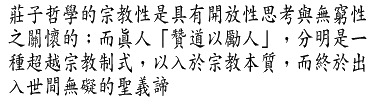 ²ø¤l¤£¬O±M§Þ·N¸qªº©v±Ð®a©Î©v±Ð¾Ç®a¡A¬pµLºÃ¸q¡F¦ýY»¡²ø¤lõ¾Ç¥u¬O¤@ºØ¡u¤Hªºõ¾Ç¡v©Î¤@¯ë·N¸qªº¡u¥Í©Rõ¾Ç¡v¡A¦Ó¤í¯Ê©v±Ð·N§t¡B©v±ÐÃöÃh¤Î©v±Ð¹Ò¬É¡A«hÅãµM¬O¤£¶g¥þªº--³o¬Æ¦Ü¥i¯à³y¦¨¬YºØIÂ÷²ø¤lªì°Jªº»~¸Ñ¡C ¦Ó»{¬°¡u©v±Ð¡v¦³¼s¸q»P¯U¸q¤§¤À¡A¨ä¹ê¬O¤@ºØÄ§t¤å¤ÆÆ[ªº¬Ýªk¡C ´N©v±Ð¡]Religion¡^ªº¦r·½¬Ý¨Ó¡A©Ô¤B¤åªºReligio¥]§t¦³¡u§ô¿£¡v¡B¡uÆ[¹î¡v¡B¡uÂà¦V¡v»P¡u®¬§ï¡vµ¥·N«ä¡A°ò¥»¤W¬O¹ï¡u¯«¡vªº°@¸Û»P«H¥õ¡A¦Ó³o¦b¤¤¤åªº¡u©v±Ð¡v¤@Ã㤤¨ÃµLªk§¹¥þ³V±o¡C¦]¦¹¡A¬°¤F¤£³Q²§¤å¤ÆªºÃ¿ÆX©Òªý»Ù¡A§Ú̦ü¥GÀ³¹ï¡u©v±Ð¡v±Ä¨ú¸û¬°¼eÃPªº·N¸q¡A¥H«K¦b¤¤°ê¤å¤Æªº¤j¨t²Î¤ºÀ³¥Î¦¹¤@¤wµMºU¤J¦è¤èÆ[ÂIªº»yÃã¡C¯S§O¬O¦b¦Ê¤t¨ÃÀÙªº¡u¹D¤å¤Æ¡v¡]¡u¹Dªº¤å¤Æ¡v©Î¡u¹D®a¤å¤Æ¡v¡^¸Ì¡AÅãµM¦¤w§Î¶ì¥XÄݤvªº©v±ÐÆ[»P©v±Ð©Ê¡A³o·íµM¤£¥²ªþ·|¦b²§¤å¤Æ©Ò´þªøªº©v±Ð©Î¯«¾Ç¤W±¡C ¤@¡B¹D¥»¦ÛµMªº¥Í©Rõ¾Ç ²ø¤l¦p¦P¦Ñ¤l¡A¤jÁ|ªÖ©w¤F¹Dªº¥ý¤Ñ¸q»P¥»®Ú¸q¡G ¤Ò¹D¡A¦³±¡¦³«H¡AµL¬°µL§Î¡F¥i¶Ç¦Ó¤£¥i¨ü¡A¥i±o¦Ó¤£¥i¨£¡C¦Û¥»¦Û®Ú¡A¥¼¦³¤Ñ¦a¡A¦Û¥j¥H©T¦s¡F¯«°¯««Ò¡A¥Í¤Ñ¥Í¦a¡F¦b¤Ó·¥¤§¥ý¦Ó¤£¬°°ª¡A¦b¤»·¥¤§¤U¦Ó¤£¬°²`¡A¥ý¤Ñ¦a¥Í¦Ó¤£¬°¤[¡Aªø©ó¤W¥j¦Ó¤£¬°¦Ñ¡C ¡m²ø¤l¡D¤j©v®v¡n ¦p¦¹²`¨ã§Î¤W·N§t»P§Î¤WÃöÃhªº¨¥»¡¡A¤@¤è±ªíz¤F²ø¤l§@¬°¤@¡u¦ÛµM¬É¤§¿W¦æªÌ¡vªº¨¤À¡A¥t¤@¤è±«h³zÅS¤F²ø¤l¨Ã¥¼¥þµM¥¸±ó¯«¯µ¥@¬É»P¯«¯µ«H©Àªº°ò¥»«H©À¡C ¦]¬°¦b¡u¹D¡vªº¥þ¦V«×¤§¤¤¡A§^¤H¨Ã¤£¥²§â¡u¦ÛµM¡v»P¡u¥Í©R¡v¤GªÌ°Ï¹j¶}¨Ó¡A¦P®É¤]¤£À³±N§^¤H»P¤Ñ¦a¸Uª«ªºÃö«Yºôµ¸µLºÝ¤©¥H°ô¶ë©Î±N¤§«Ê³¬¦b³à¥¢·N¸qªºÅÞ¿è§Î¦¡¤¤--ÅãµM¡A²ø¤l¬O¬¡¦bª«§Ú¤¬³q¥H¦Ü©ó¤H¯«¤@Å骺¥@¬É¸Ì¡C ¥»¨Ó¡A¦Ñ¤l§@¬°²ø¤lªº¥ý¦æªÌ¡A¤w¦b¡u¹D¡vªº°ò¦©Ê«ä±©¤¤¡A±N¡u¹D¡v©Òħtªºªñ¦ü¡u¯«¸t¸gÅç¡vªº·N¸q©ñ¤JÓÅé¥Í©R¡A¨Ã¶i¦Ó¤@³wÁÚ¦V¨º»P¦¹¥Í¦¹¥@¤£Â_ÁÅÅ㪺²`»··N§t¤¬¬Û¥æ¯Aªº¶W¶V¬É¡C ¦Ñ¤l¤D¥H¡u¶H«Ò¤§¥ý¡v¡]¡m¦Ñ¤l¡D¥|³¹¡n¡^»P¡u²`®Ú©T¬k¡Aªø¥Í¤[µø¤§¹D¡vµ¥²×·¥¤§ÃöÃh¡A³]ªk³q¹L¸ñªñ©v±Ð¡]¦ü¥G¤]¥i¥H´À¥N¬Y¨Ç§Î¦¡ªº©v±Ð¡^ªº¤è¦¡¡A¥H¨¤ß¤@Åé¡B°ÊÀR¤@¦p¡B§Y·Ó§Y±Iªºª½Æ[¡]¥ç§Yºë¯«¤§ª½Æ[¡^¡Aß«´©ó¹D¡A¨Ã±q¦Ó¤W¹F©ó¡u¯«°¯««Ò¡A¥Í¤Ñ¥Í¦a¡vªº¡u¸tÀqµM¡v¹Ò¬É¡C¦Ñ¤l¤§µL¨¥»PµL¬°¡A¦Û¬O¦¹¤@¡u»P¹DߦX¡vªº¸gÅç¨ÏµM¡C ¦Ó²ø¤lÅãµM¤ñ¦Ñ¤l§ó¯àÅé¶K¡u¦ÛµM¡vªº¶ø¸q¡A¯S§O¬O¦b¡u¦ÛµM¡v§@¬°¤@¾úµ{ªº«e´£¤U¡A¡u¹D¦Û¨¡vÅkµM±q¡u¾úµ{ªº¨É¨ü¡vÂର¡u²z·Qªº±µ«Ý¡v¡C ¦p¦¹¡A®É¶¡¸qªº©l»P²×¤D¤J©ó¶W®É¶¡¸qªºµL©l¡BµL²×¡BµL½a»PµLºÉ¡C¦Ó³o²ö«D¬O²ø¤l»{¦P¦¹¤@¡u¦ÛµM¡v¬°¤@¡u¦³¥Í©R¤§¦ÛµM¡v¡]©Î¡u¦³¾÷¤§¦ÛµM¡v¡^¡A©ó¬O±N¡u©l¡v¸Ñºc¬°¡uµL©l¡v¡A±N¡u²×¡v¸Ñºc¬°¡uµL²×¡v--³o¬O²ø¤l¹ï®É¶¡ªº¶W¶V¡A¤]¦P®É¬O¦Ñ¤l¡u¹Dªk¦ÛµM¡vªº¶ø¸qª½±µçE®i©ó¥Í©RµL½a¤§¯ßµ¸©Ò¨ãÅ馨´NªÌ¡C ·íµM¡A²ø¤l¤§¡u¦ÛµM¡v¤]¦³¨ä¹ïÀ³©ó¡u¥@¬É¡vªº¼s«×»P²`«×¡A¦Ó¤Ñ¦a§@¬°¦ÛµM¤§³õ°ì¡A¨Ã¤£¥²¥HªÅ¶¡¬°¨Ì¾Ì¡C¦]¦¹¡A²ø¤l¦b¨ä®ð½×¤Þ»â¤U¡A¤£Â_´¦Åã¤Ñ¦aÅܤƤ§½t¥Ñ¡A¨Ã¦b¡u³±¶§¡v§@¬°¸Uª«¤§ºc§@ì²z»P¦s¦bì²zªº¹ê¦s¹Òªp¤¤¡A¤£Â_³zÅSª«ª«¦Û¤Æ¦Û¥Í¤§®ø®§¡A¦Ó³o¨ä¹ê¤w¶W¥X¤@ªÑ¥H¾÷±ñ½×¬°Â¦¥Ûªº¦t©zÆ[ªº½d¡A¦]¬°¡u³q¤Ñ¤U¤@®ð¡v¡]¡m²ø¤l¡Dª¾¥_¹C¡n¡^ªº°ò¥»©RÃD¡A¨Ã¤£Ãø¥Ñ¡u¦ÛµM¡vªº·N¸q¤©¥HÀò«ù¡A¦Ó©Ò¿×¡u¤Ï¨ä¯u¡v¡]¡m²ø¤l¡D¤j©v®v¡n¡^¤D¦®¦b¦^ªð§^¤H¥Í©R¥»µM¤§ª¬ºA¡A¦¹¤S¥²¶¶¦ÛµM¤§¹D¤D±o¥H¹F¦¨¡C ¦]¦¹¡AY¦ÛµM»P¥Í©R¥»¬°¤@Å骺¸Ü¡A«h¦s¦³»P»ùȪº¦X¤@¤§½×±N¨ÌµM¹ï²ø¤l¨ã¦³²`¸q¡F¦P®É¡A·½¦Û¥j©v±Ðªº«äºû¼Ò¦¡¡A«h¦b¯«¸Ü»Põ¾Ç¤§¶¡§ä¨ì´Ï®§¤§©Ò¡A²×¯à¶W¥XÓ¤H¤§·P©x¸gÅç¡A¤Þ¨¶i¤J¡u³Ð³y©Ê·Q¹³¡v¤§¥@¬É--¦Ó¦¹¤@¥@¬É§Y¤@¿Ä¦s¦³¡B¤u¤Ò¡B¥Í¾÷¡B²z·Q»P»ùȪº©M¿Ó¦Ó¬üµ½¤§¥@¬É¡G ²ø¤l¬O¦b¥»½è½×¡B¦s¦b½×»P¹Ò¬É½×¤§¥~¡A¸Õ¹Ï¶}µo¥X¤@¯u¹êªº³õ°ì¡A¥H¨Ñ§^¤H¹£ÁþµLÃ䪺·Q¹³¡F¥L¨Ã³]ªkÅãÁŧ^¤H¤§ª¾©Ê»P¼w©Ê¡A¥H¨Ï§^¤H¤ßÆF¯à°÷¤ÉÄË©ó¥ô¦óªº©w©Î«Ê¬É¤§¥~¡C ¦p¦¹¡A¥Ñ¤Ñ¤H¦³¤À¥H¦Ü©ó¡u¤Ñ»P¤H¤£¬Û³Ó¡v¡]²ø¤l¤j©v®v¡^¡A¤H¤§»P¦t©z¬Û°Ñ¤¬°ÊªºÃö«Y¤D¤j¥i»P²ø¤lªº×¾i½×¡B¹ê½î½×»P¤u¤Ò½×§@²`¨ã¯à°Ê©Ê»P¶}©ñ©Êªº©IÀ³¡C¦]¦¹¡A¦b²ø¤l¦t©z¥]ù¤Ñ¦a¸U¶HªºÂ×´Iħt¤¤¡A³Ìȱo§^¤Hª`·Nªº¬O¦t©z¸Uª«©Ò¥H¤@ÅéѦbªº©M¿Ó»P¬üµ½--¬O¦s¦b»P»ùȵL¶¡ªº¬¢¦X¡A¥ç¬O¹D³q¤Ñ¦aªº¥È¦P¤§¹Ò¡C ¨ä¶¡¡A²ø¤l¤D¯à¦Û¥D¦a±Ò°Ê¨ä³p»»¤§¹C¡A¨Ã¤£Â_®i¶}¨ä¤u¤Ò¶iµ{¡A¥H¨´©ó¯u¤H¦Ü¤Hªº²×·¥²z·Q¡C¦Ó©M¿Ó¤£§«®í²§ªºÅܤơA¬üµ½·½¦ÛµL½aªº¥Í¾÷¡A¦]¦¹¡A²ø¤l¦t©z½×ªº«n·N¸q¨ä¹ê¬O»P¨ä¤H¥Í»ùȽס]¨ä¤¤´J§t¦Ü¥