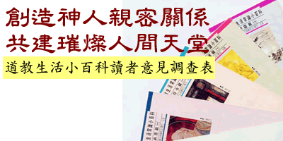 《道教生活常識小百科》預定出版100種,計劃以1000個題來 解答生活上經常遇到的宗教疑問。讀過本網頁中已出版的這些 問答集後,您一定有很深的感觸吧!歡迎您利用以下這份簡扼 的問卷在網上告訴我們!更歡迎您打電話或親自來文化院和我 們結緣,以下資料請詳細填寫,我們將陸陸續續提供您免費的 宗教服務與精美書刊。