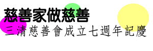 三清慈善會成立七週年了,其行愛心發揮的功能,為政府內政部列為績優之慈善團體,實至名歸,實難能可貴的,我們貴為此團體之一員。尤其三清慈善會,不惟是以慈善家做慈善,並以宗教家做慈善實行愛心天下,所謂代天行道。認為所有人類都是天的親生子,而且親生子不能全是好的而沒有壞的,不能全是善而無惡的。但對於好的善的固然要加以愛護,對於壞的惡的亦不思加以傷害或棄之,祇可予以教化,使盡歸于好與善。所以教化人歸善,為宗教家行愛心做慈善的目的。中國古代有墨子止戰兼善的主張,旨在使天下人一律相親相愛,無爭無奪。三清慈善會則兼宗教家行慈善;善用宗教家作精神之布施,以解救人類的性靈,如此雙管齊下,以達到三清慈善會設立之宗旨與目的。