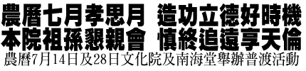 【本院訊】 農曆七月不是鬼月,心祥則百事宜,在中國稱是瓜月,乃為紀念東漢的孝女曹娥,投江尋找因為洗瓜不慎跌入江中的父親而名,因此七月便是孝思月,是敬拜祖先、感恩祖先,為祖先造功立德最好的月份。 有鑑於此,本院特於農曆7月13日舉辦祖孫懇親會。同時也於農曆7月14日及28日分別於民生二路文化院及南海堂舉辦普渡活動,以提醒人們不但要慎終追遠,且對無血緣關係的眾鬼,也應給予關懷及照顧,故設宴款待無主孤魂,猶如陽間的行善佈施,讓眾魂受益,希望大家共襄盛舉。 (讀者欲為祖先造功立德者,可至本院索取功德榜) (祖孫懇親會說明文件由此點入) (請參改「祭祖盡孝者須知」) ;(普渡施食文疏)