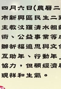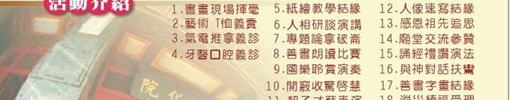 ◎法會新聞稿 ◎法會照片輯 ◎活動日程表 ◎法會請柬 ◎難忘的日子 ◎善書朗讀比賽 ◎公路渡亡善魂施善功德榜 ◎法會對聯 ◎我們的主教:汶羅祖師 ◎消災植福文疏 ◎先靈追功證果文疏 ◎魁星開竅啟智文 ◎全省公路渡亡鸞文 ◎法會功德金明細暨登記表 ◎汶羅清水祖師的神德 ◎文化院法會的特色